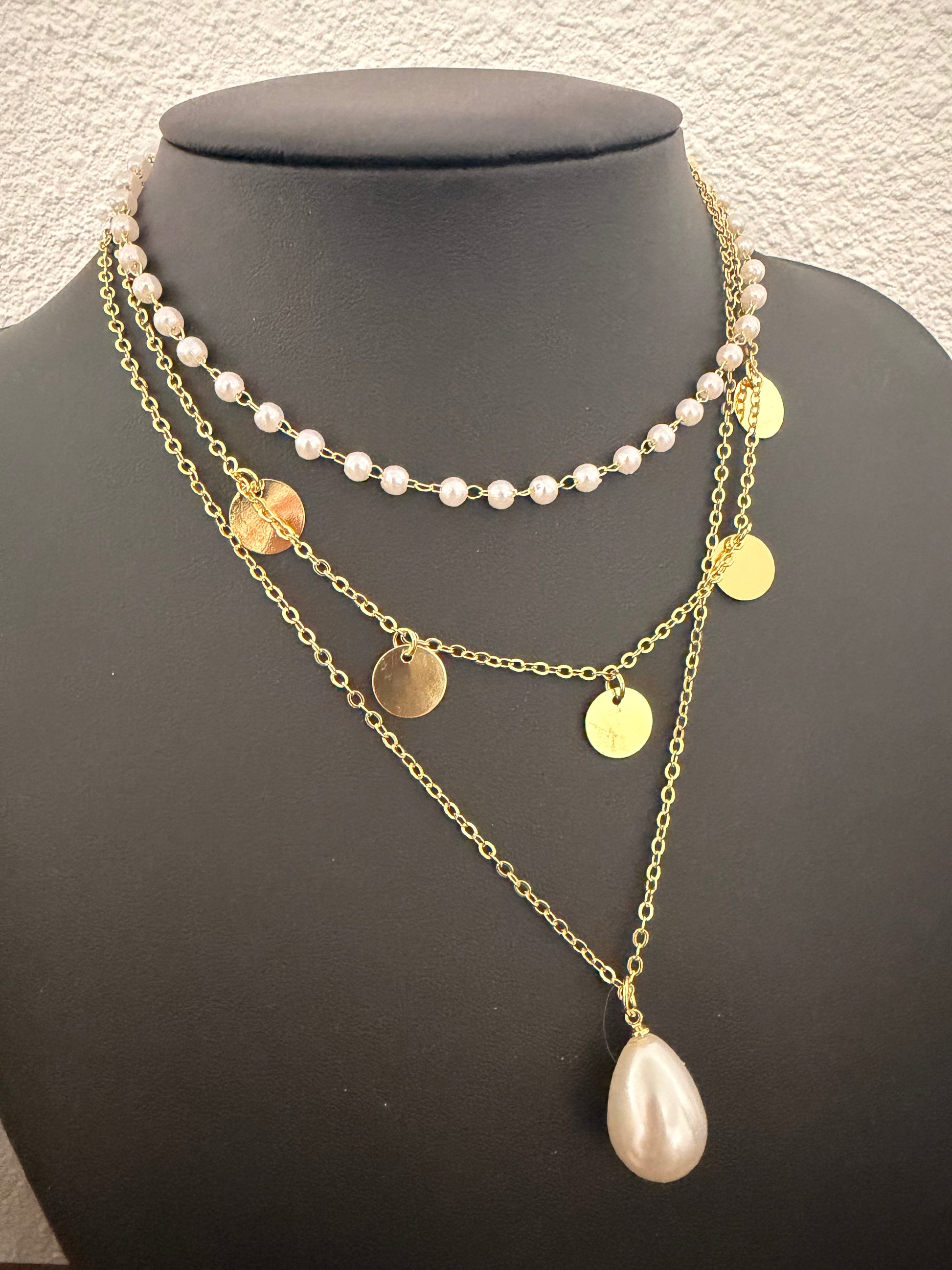 Ce sautoir en acier inoxydable allie élégance et modernité avec son jeu de chaînes délicates, de perles fines et de médaillons dorés. Il se distingue par sa goutte perlée en finition, qui apporte une touche chic et féminine à l’ensemble.