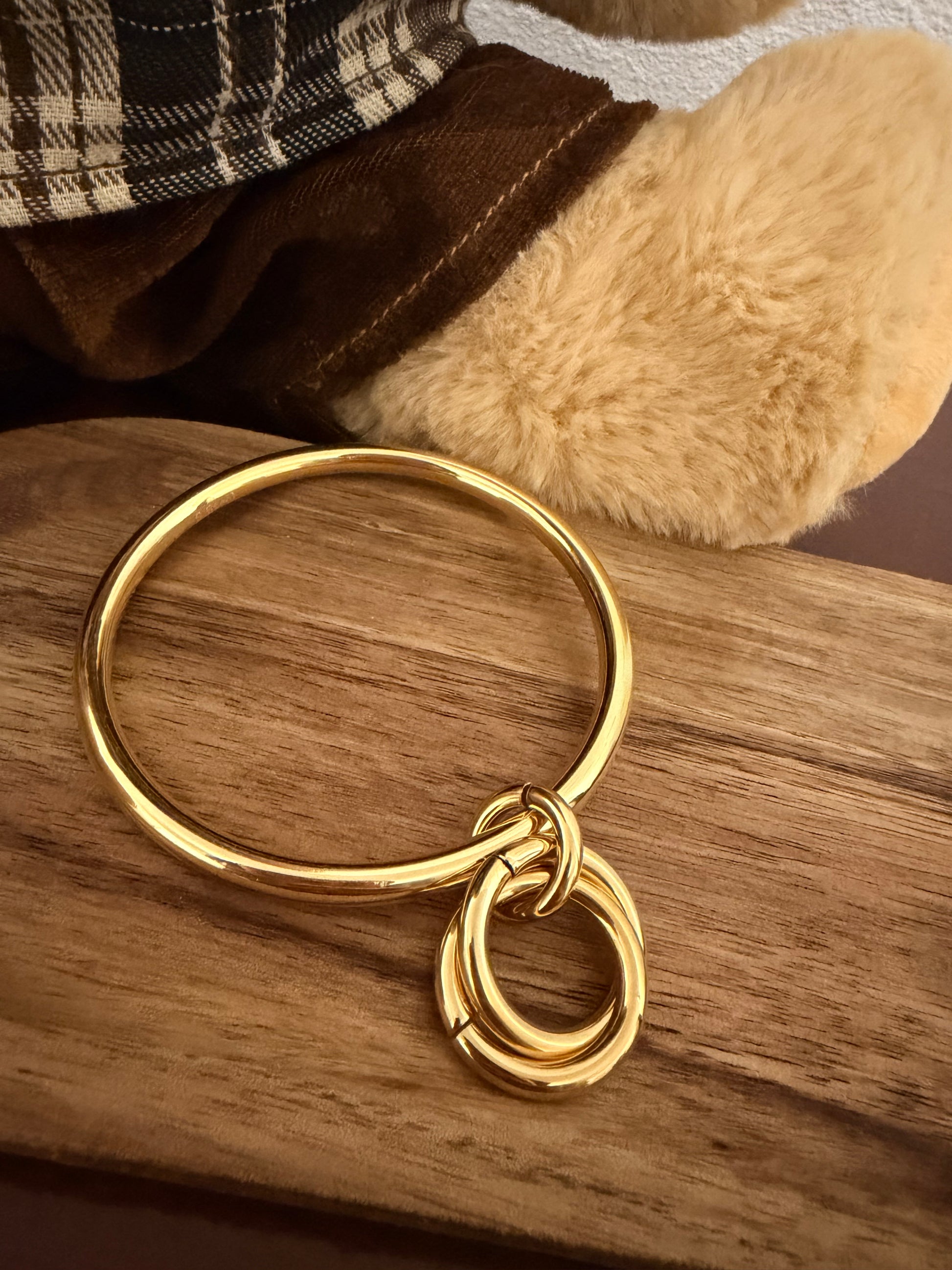 Ces joncs en acier inoxydable doré se distinguent par leur design épuré, rehaussé de deux petits ronds délicatement accrochés, apportant une touche moderne et élégante. Leur style minimaliste en fait des bijoux faciles à porter seuls ou en accumulation.