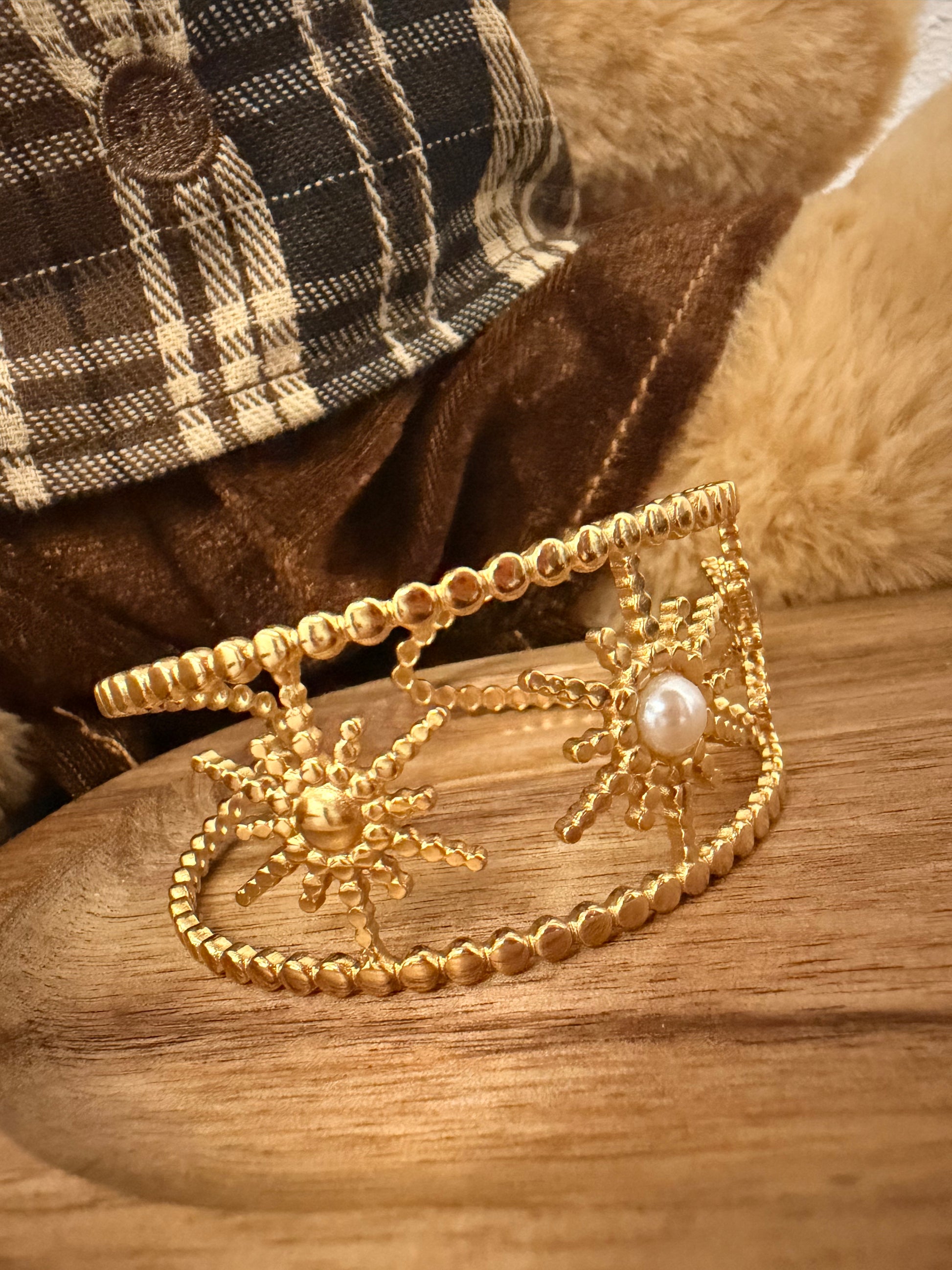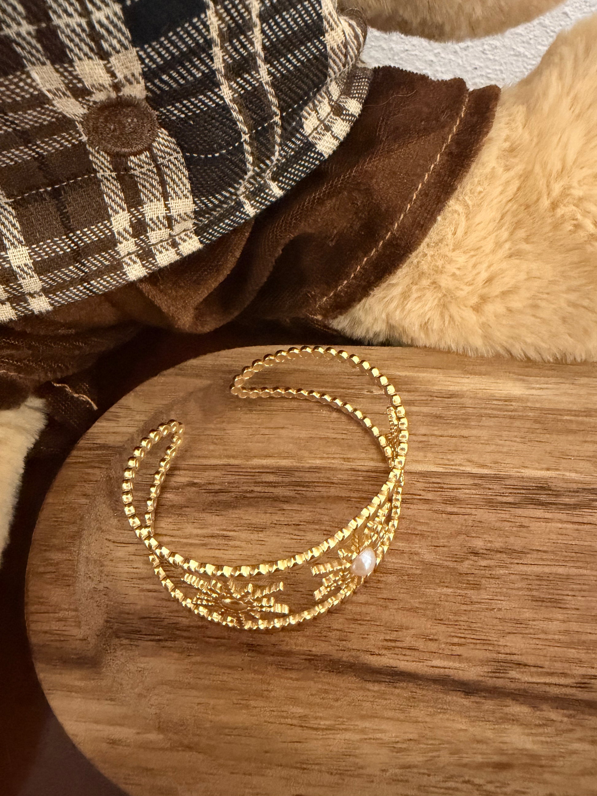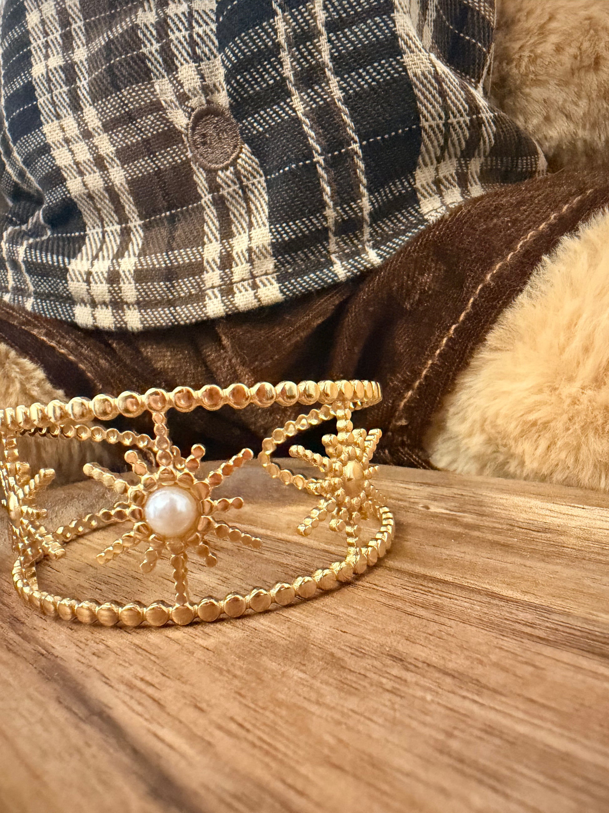 Manchette raffinée en acier inoxydable, au design solaire et résolument chic. Son anneau perlé finement travaillé accueille de délicats motifs soleil en relief, symbole de lumière.